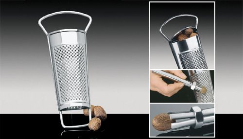 All stainless steel, this nutmeg grater has a handy storage bin at the top to keep your nutmeg close at hand. Shown with our #10221R Nutmeg Holder, not included. 6.25" x 2"